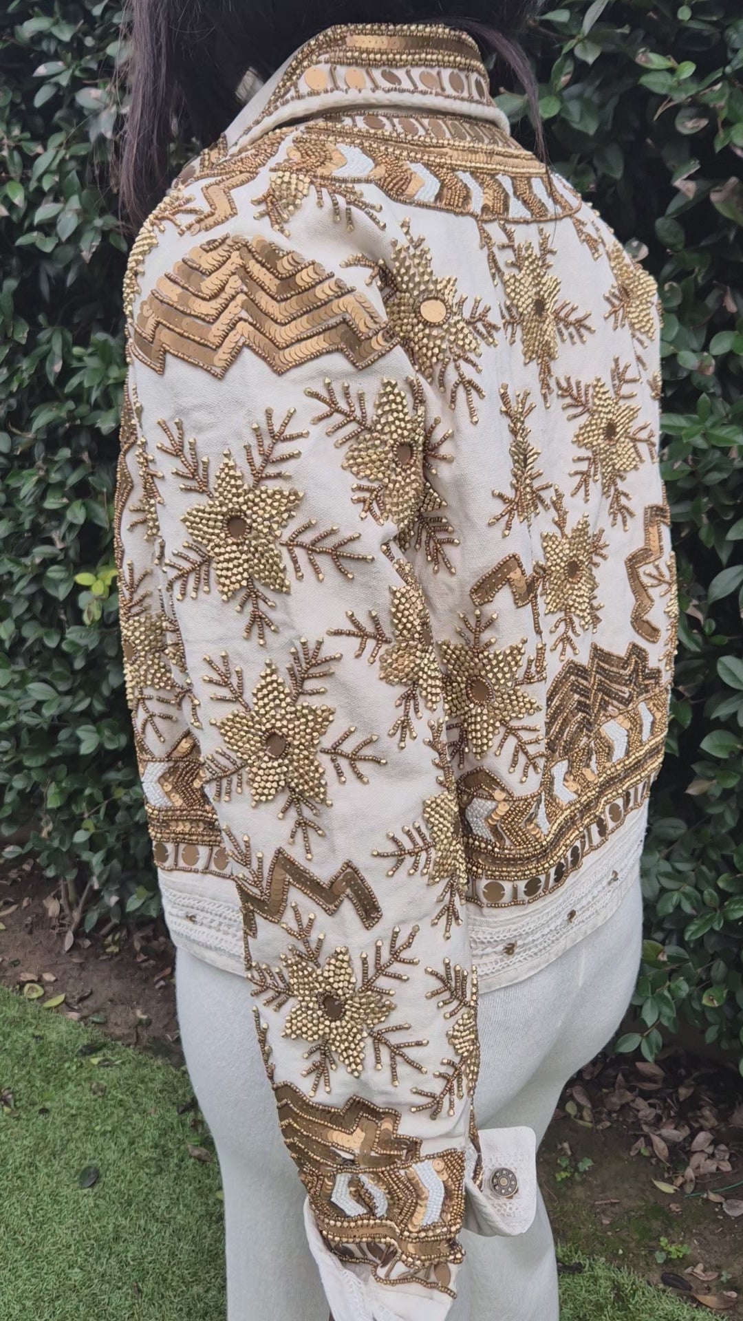 Questo giacchino, realizzato interamente a mano, presenta un ricamo prezioso in oro che crea motivi geometrici e floreali di straordinaria eleganza. Ogni dettaglio – dalle applicazioni alle micro perline – è frutto di un lavoro sartoriale complesso e di grande pregio, rendendo ogni capo un pezzo unico e irripetibile.